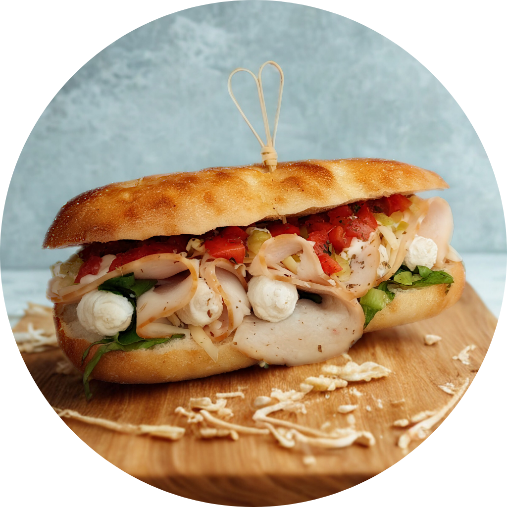 Γαλοπούλα ή ζαμπόν, Gouda, ντομάτα, μαρούλι, μαγιονέζα.